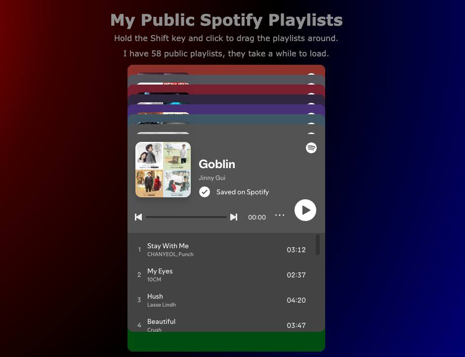 Initially, I wanted it to be a long hold of the mouse to trigger the click and drag– but after much debugging with the help of Copilot and Perplexity, I settled on adding a keyboard trigger with some instructions to help make the interaction easier to implement. (One of my friends who tested out the site when the desktop version was done said that multiple playlists can be played at the same time– an unintentional, silly quirk.)
